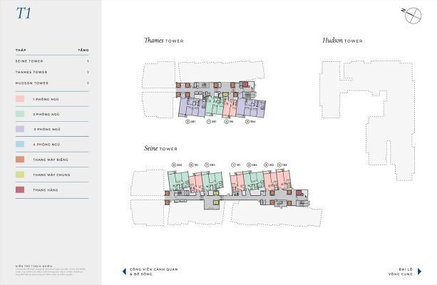 The River Thủ Thiêm được quy hoạch trên tổng diện tích 15,378m2 với 3 tòa tháp mang tên những dòng sông nổi tiếng thế giới: The Seine cao 12 tầng, The Thames và The Hudson cao 18 tầng. Tổng thể dự án cung cấp 525 căn hộ cao cấp, bao gồm 501 căn tiêu chuẩn, 12 penthouse sang trọng và 12 pool villa đẳng cấp. Mỗi tháp được trang bị hệ thống thang máy hiện đại với sảnh riêng biệt, đảm bảo sự riêng tư tuyệt đối cho cư dân.