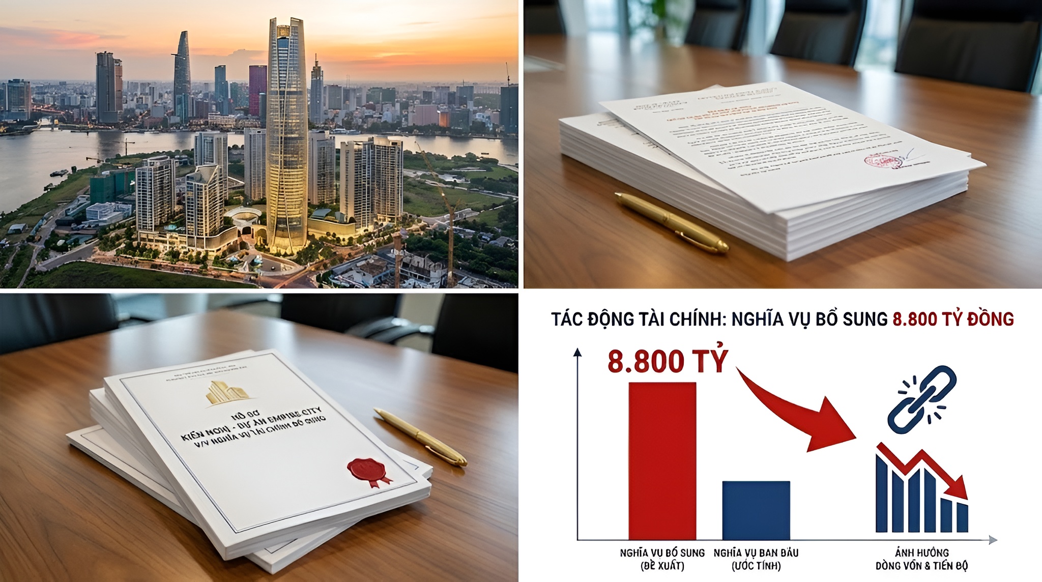 Công ty TNHH Liên doanh Thành phố Đế Vương — chủ đầu tư dự án Khu phức hợp Tháp quan sát Thủ Thiêm (thương hiệu Empire City) — đã có văn bản gửi Chủ tịch UBND TP.HCM kiến nghị xem xét và xác định lại nghĩa vụ tài chính bổ sung liên quan tới tiền sử dụng đất của dự án sau khi thành phố đề xuất khoản thu bổ sung lên tới hơn 8.800 tỷ đồng.